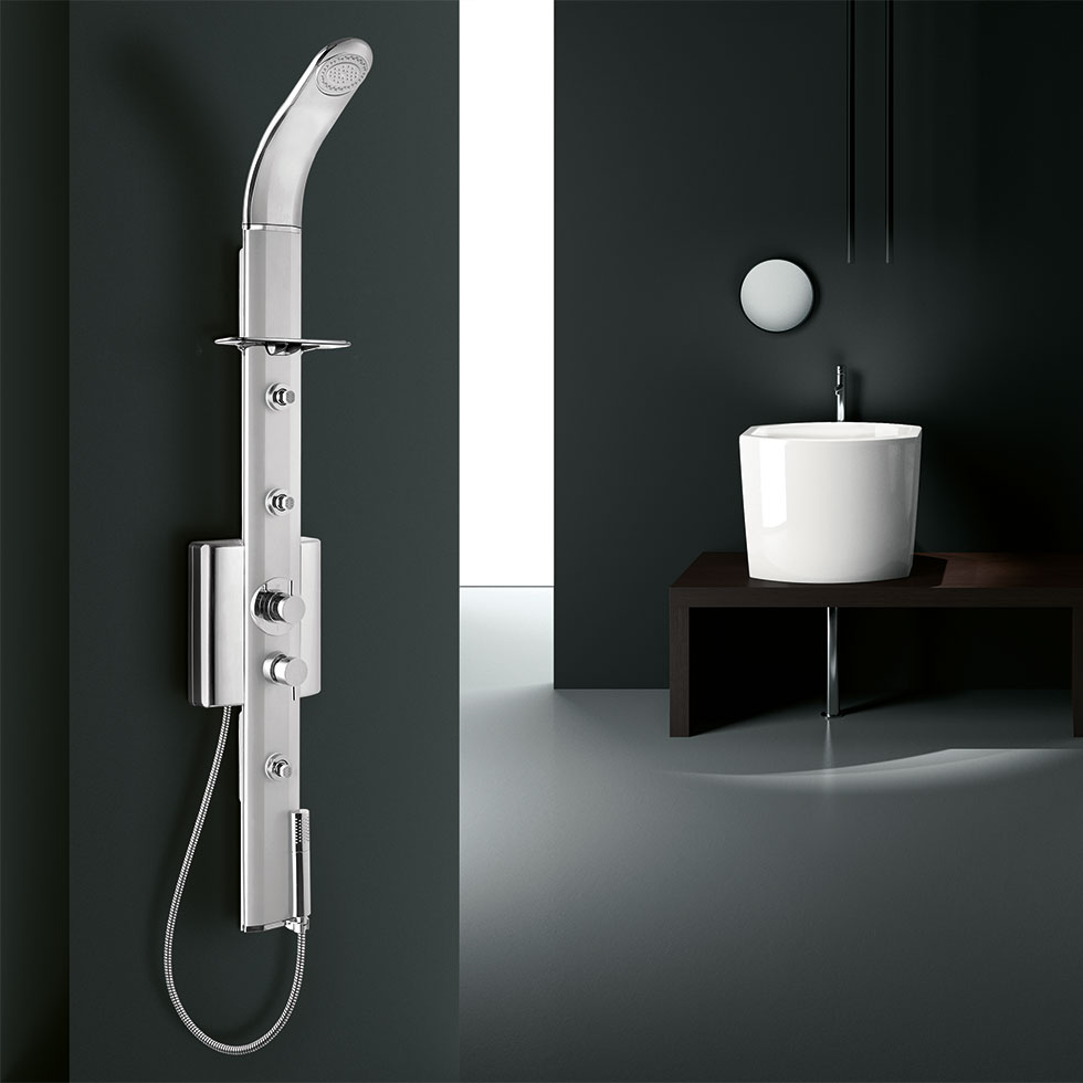 Περιγραφή: Στήλη ντους-υδρομασάζ από αλουμίνιο. Με περιστρεφόμενη κεφαλή ντους ‘anticalcare’ κατά της συσσώρευσης αλάτων, τηλέφωνο ντους ‘anticalcare’ με σπιράλ 1,5 m., στήριγμα τηλεφώνου, 3 jet υδρομασάζ κατευθυνόμενα ‘anticalcare’, σαπουνοσπογγοθήκη-θήκη σαμπουάν μεταβλητού ύψους, θερμομικτική μπαταρία με εκτροπέα 3 εξόδων, 6 επιλογές ροής. Ιδανική πίεση νερού 3-4 bar. Εγκατάσταση: α) σε επίπεδο τοίχο β) σε γωνία με γωνιακό κάλυμμα σωληνώσεων Sgcorn