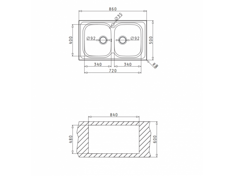 Διαστάσεις Νεροχύτη: 860 x 500mm